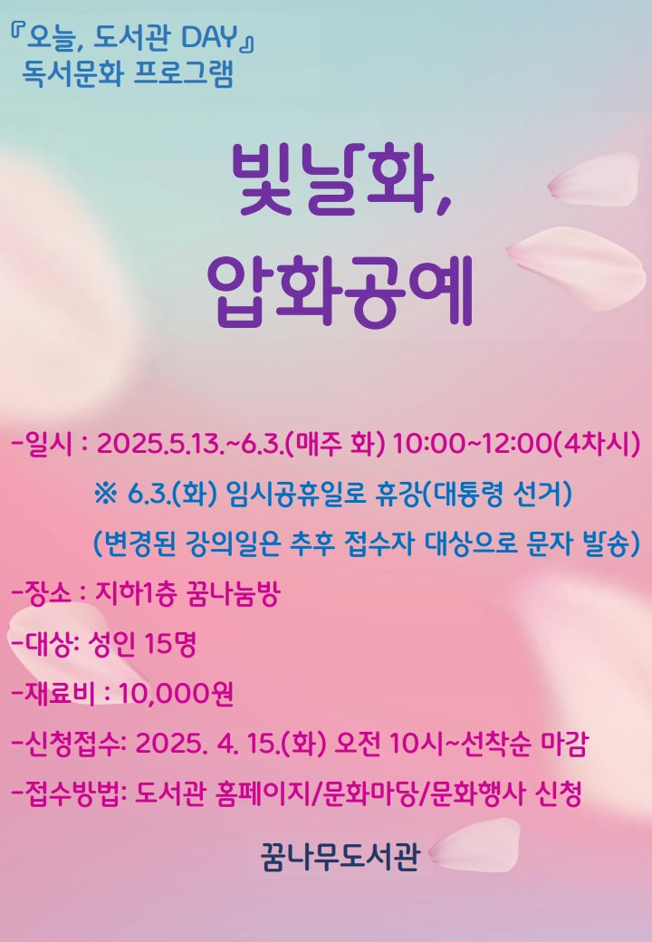 | 강좌명 | 꿈나무도서관 2025년 상반기 『오늘, 도서관 DAY』 독서문화 프로그램 안내: 빛날화, 압화공예 종료 |