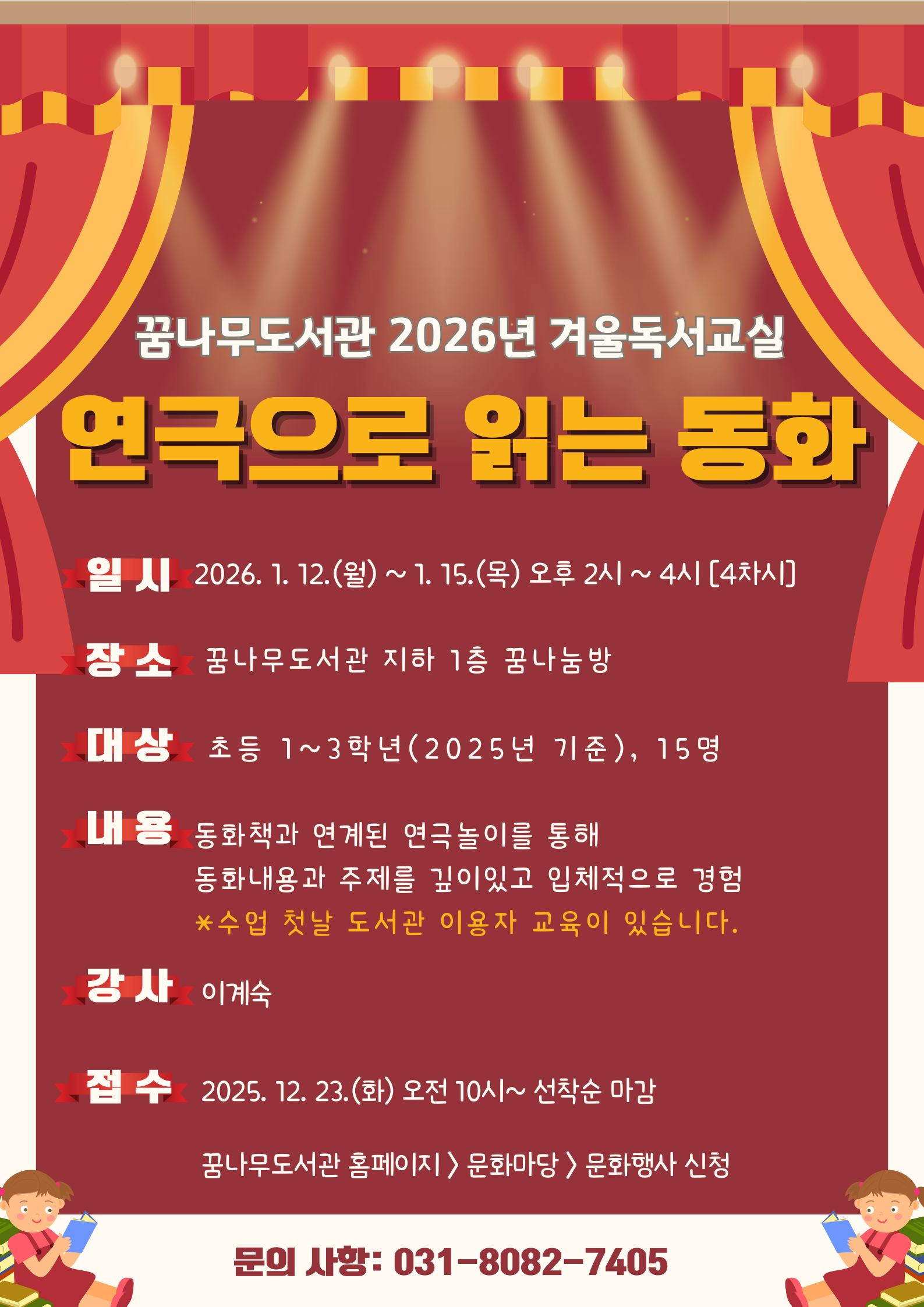 | 강좌명 | [2026년 겨울독서교실] 연극으로 읽는 동화 예정 |