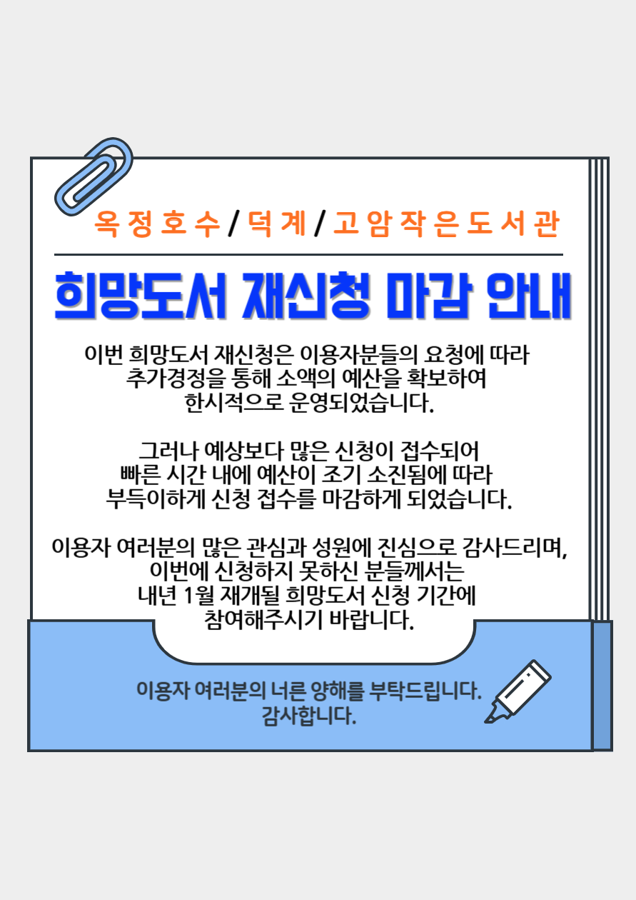 (옥정호수/덕계/고암작은도서관) 희망도서 재신청 마감 안내