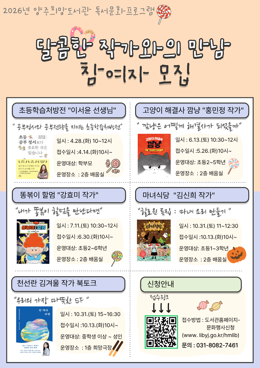 양주희망도서관에서는 시민이 좋아하는 작가님들과 함께 달콤한 작가전을 운영합니다.