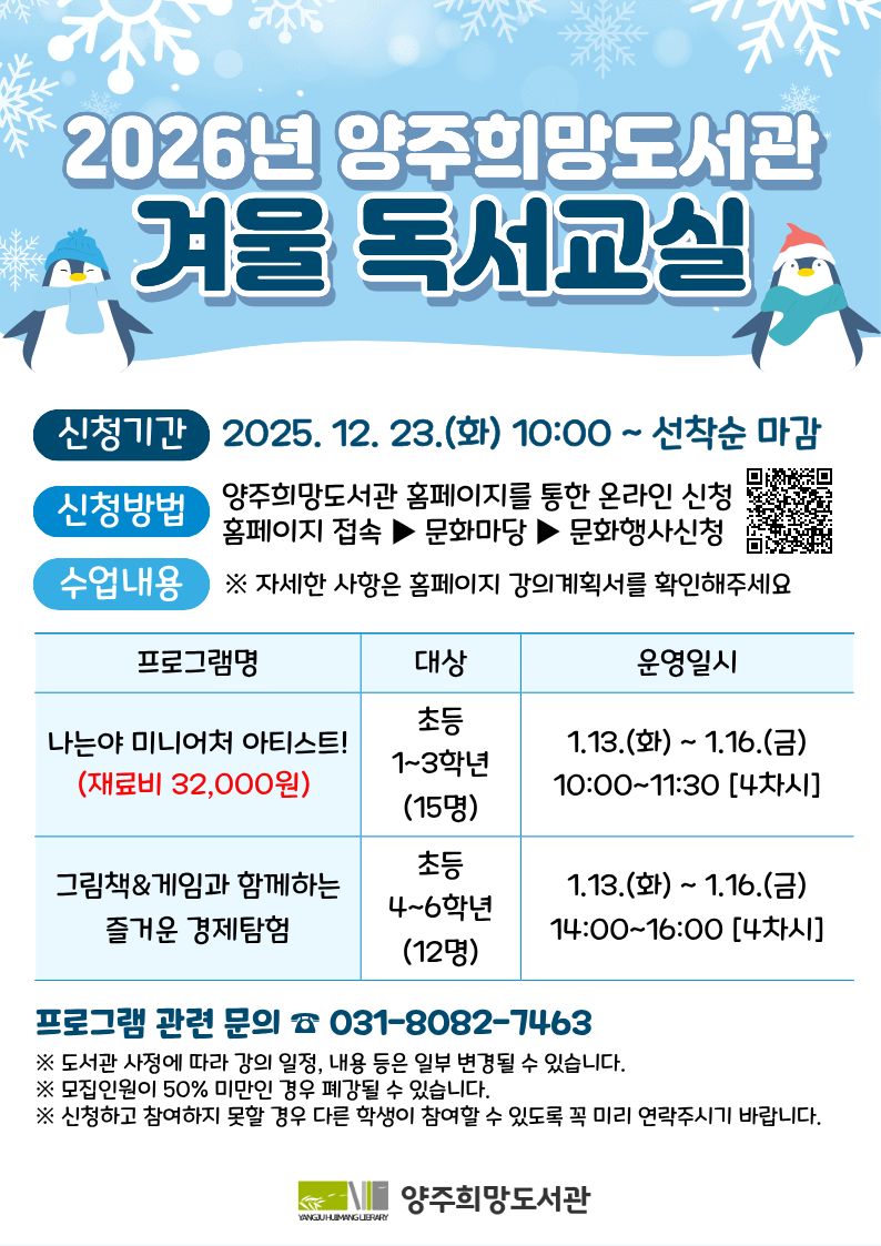 ![]() ▮ 일시 : 2026. 1. 13.(화)~ 1. 16.(금) 10:00~11:30 (4차시) ▮ 강사 : 유진선 ▮ 대상 : 초등 1~3학년(2026년 기준) ▮ 재료비 : 32,000원(추후 접수자 대상으로 안내 문자 발송 예정) ▮ 유의사항 ▸ 재료비 및 개인 준비물 등 자세한 사항은 수업계획안(첨부파일)을 참고해주세요. ▸ 재료 주문이 완료된 시점에는 재료비 환불이 어렵습니다. ▸ 재료비 미입금 시 수업 신청이 취소 처리됩니다. ▸ 부모님 아이디로 접수할 시 참여할 학생의 이름을 적어주시기 바랍니다. ▸ 모집인원이 50% 미만인 경우 폐강될 수 있습니다. ▸ 신청하고 참여하지 못할 경우 다른 학생이 참여할 수 있도록 꼭 미리 연락주시기 바랍니다. ▸ 프로그램에 참여하는 경우 도서관 홍보에 사용될 사진에 대한 촬영 및 사용을 동의하시는 것으로 간주됩니다. ▸ 도서관 사정에 따라 강의 일정, 장소, 내용 등은 일부 변경될 수 있습니다. ※ 문의 : ☎ 031-8082-7463 |