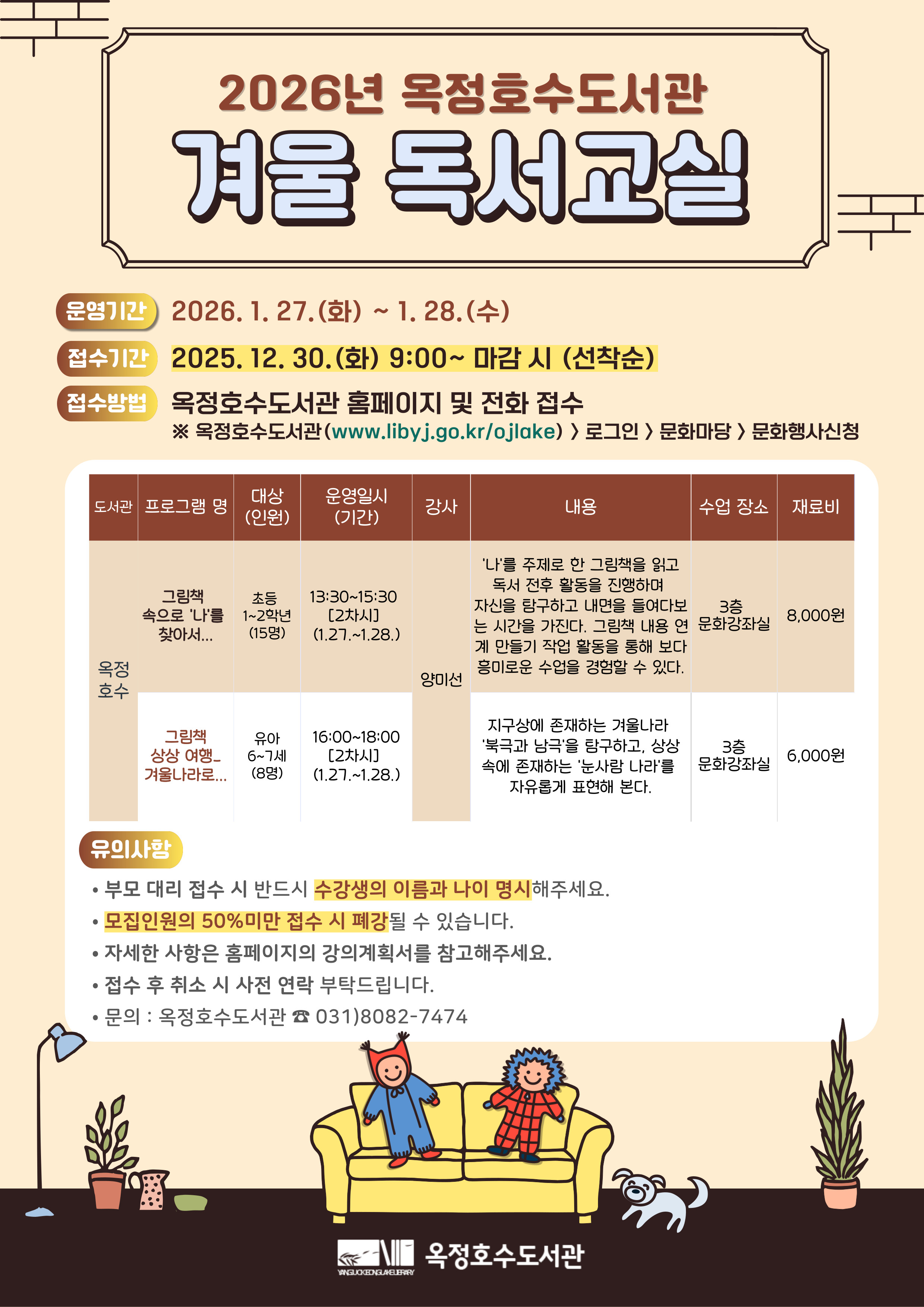 ![]() 2026년 옥정호수도서관 겨울 독서교실 운영 안내 <그림책 속으로 '나'를 찾아서...>